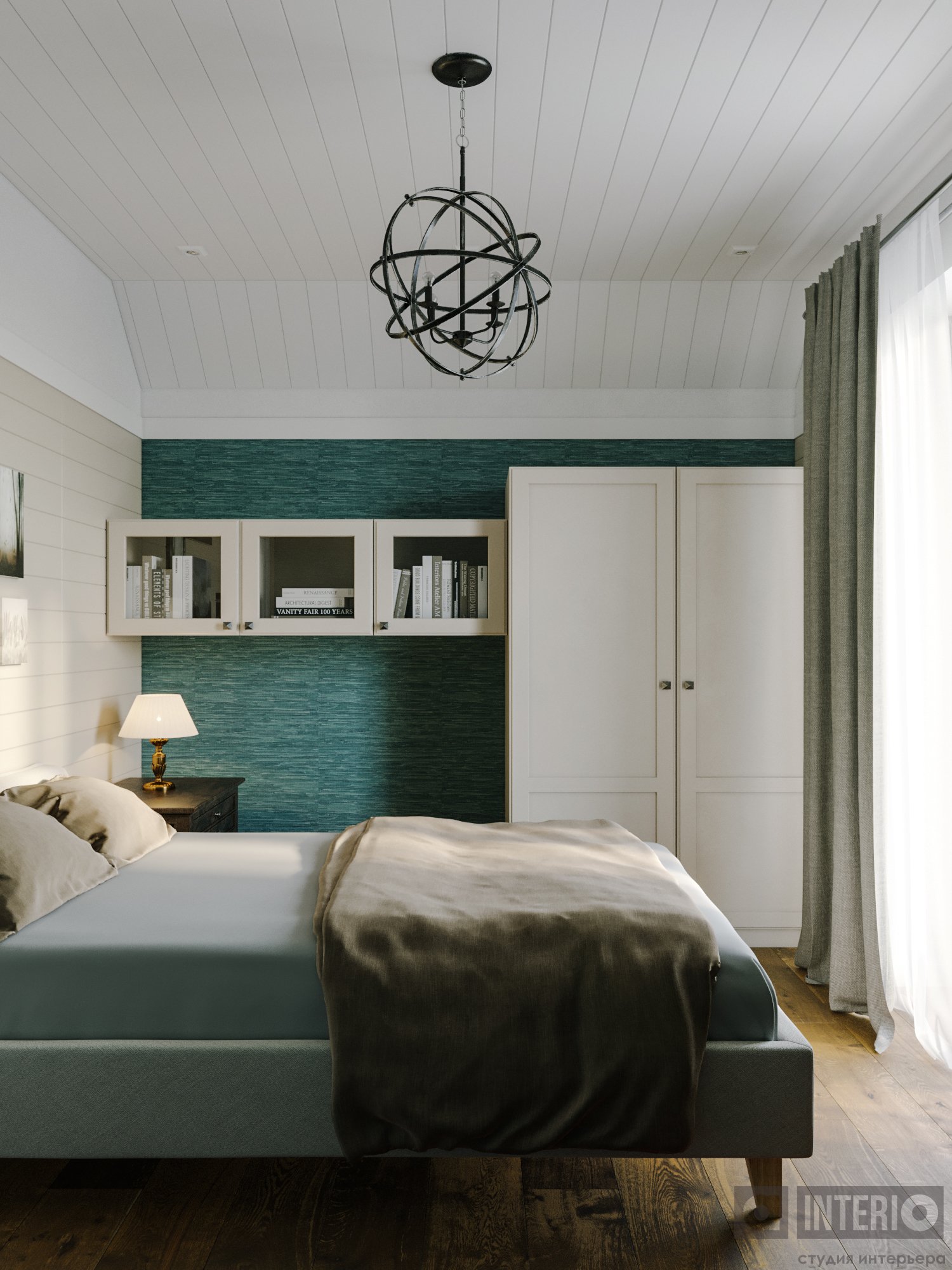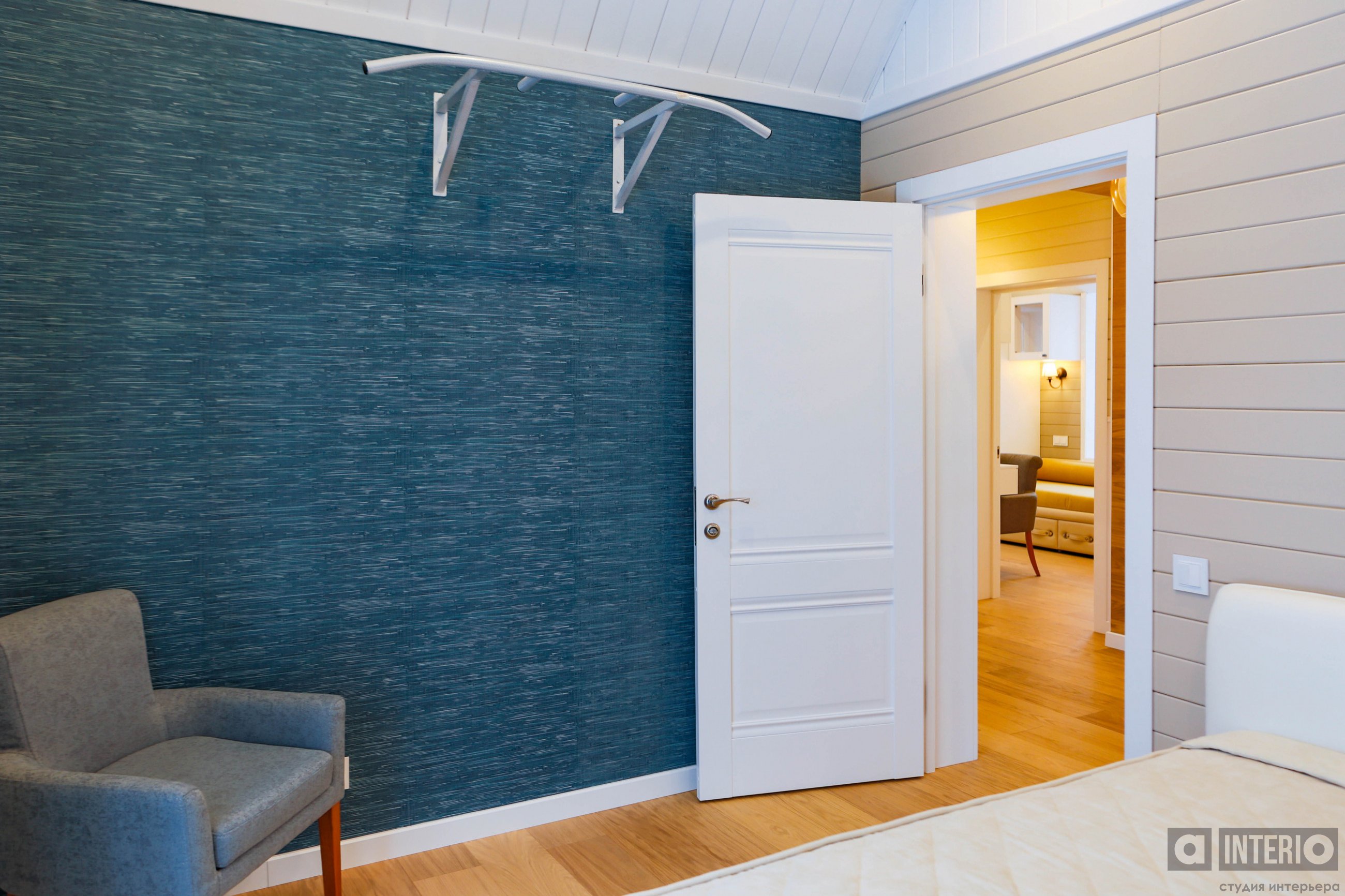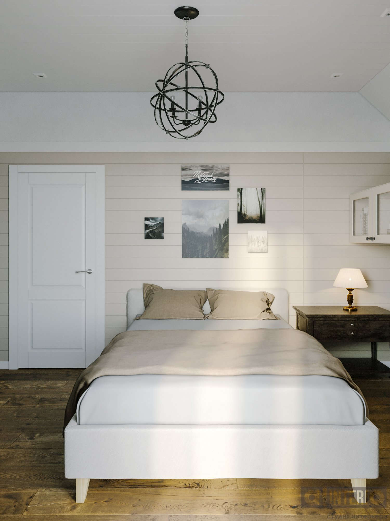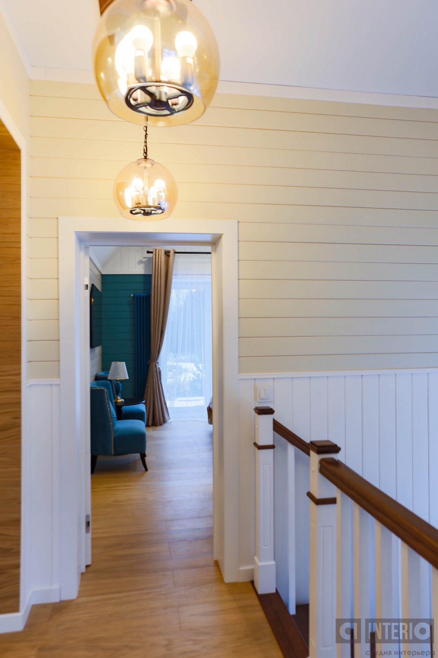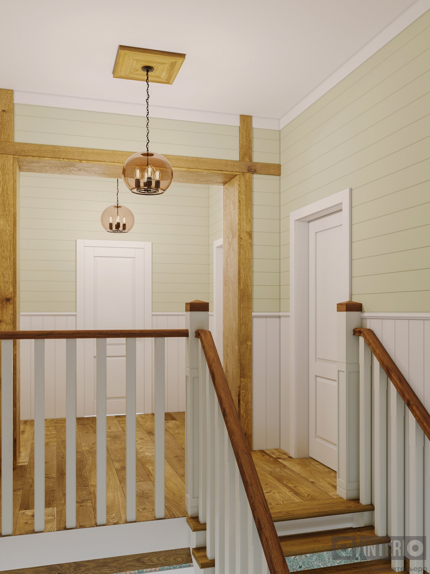 Дизайн этого загородного дома был создан для состоявшейся семейной пары, с уже взрослыми детьми. Планировка этого дома представляет собой двухуровневое пространство. Первый этаж - большое открытое помещение гостиной и столовой с кухней, 2-й этаж - на который ведет красивая ажурная лестница - приватное пространство спален хозяев и их детей.