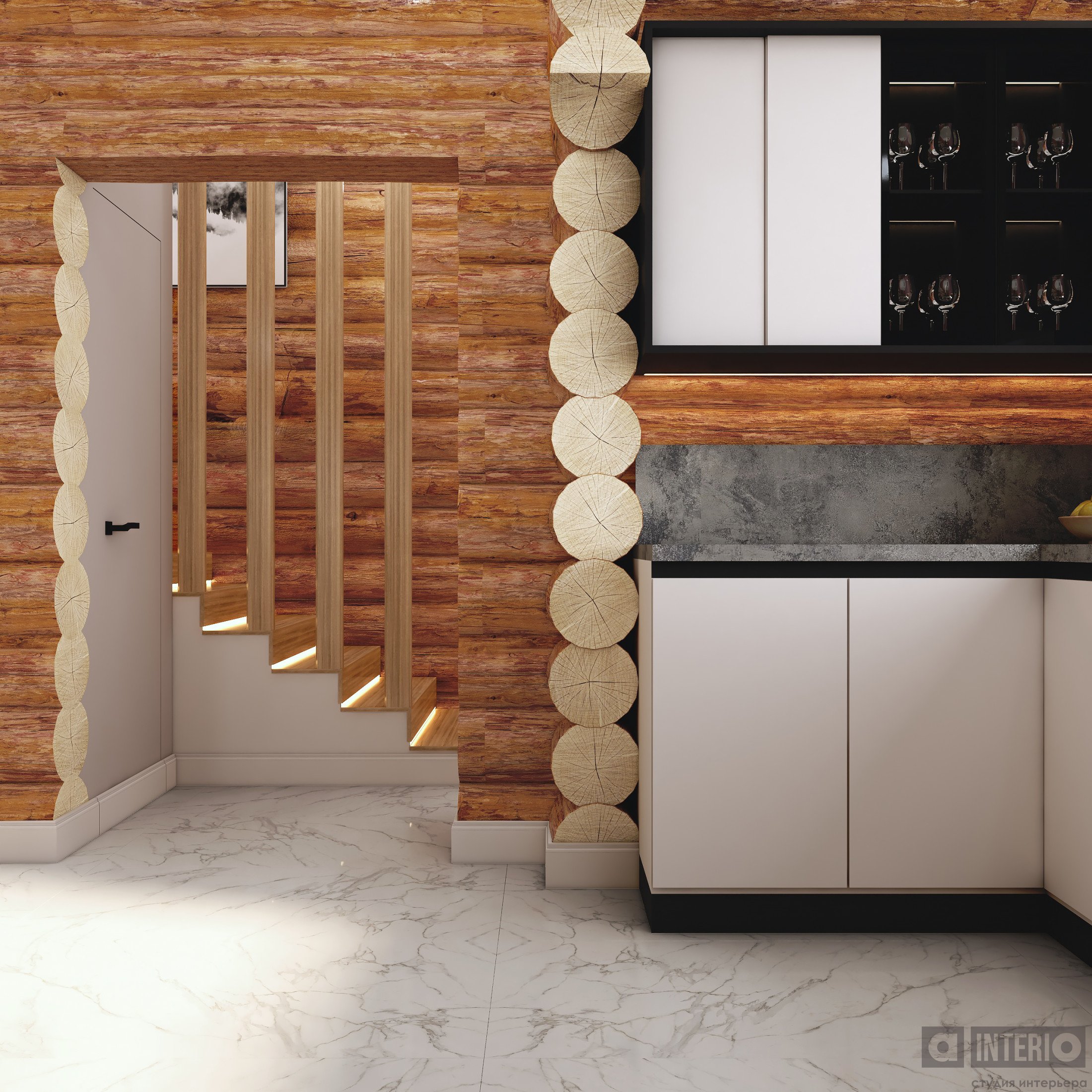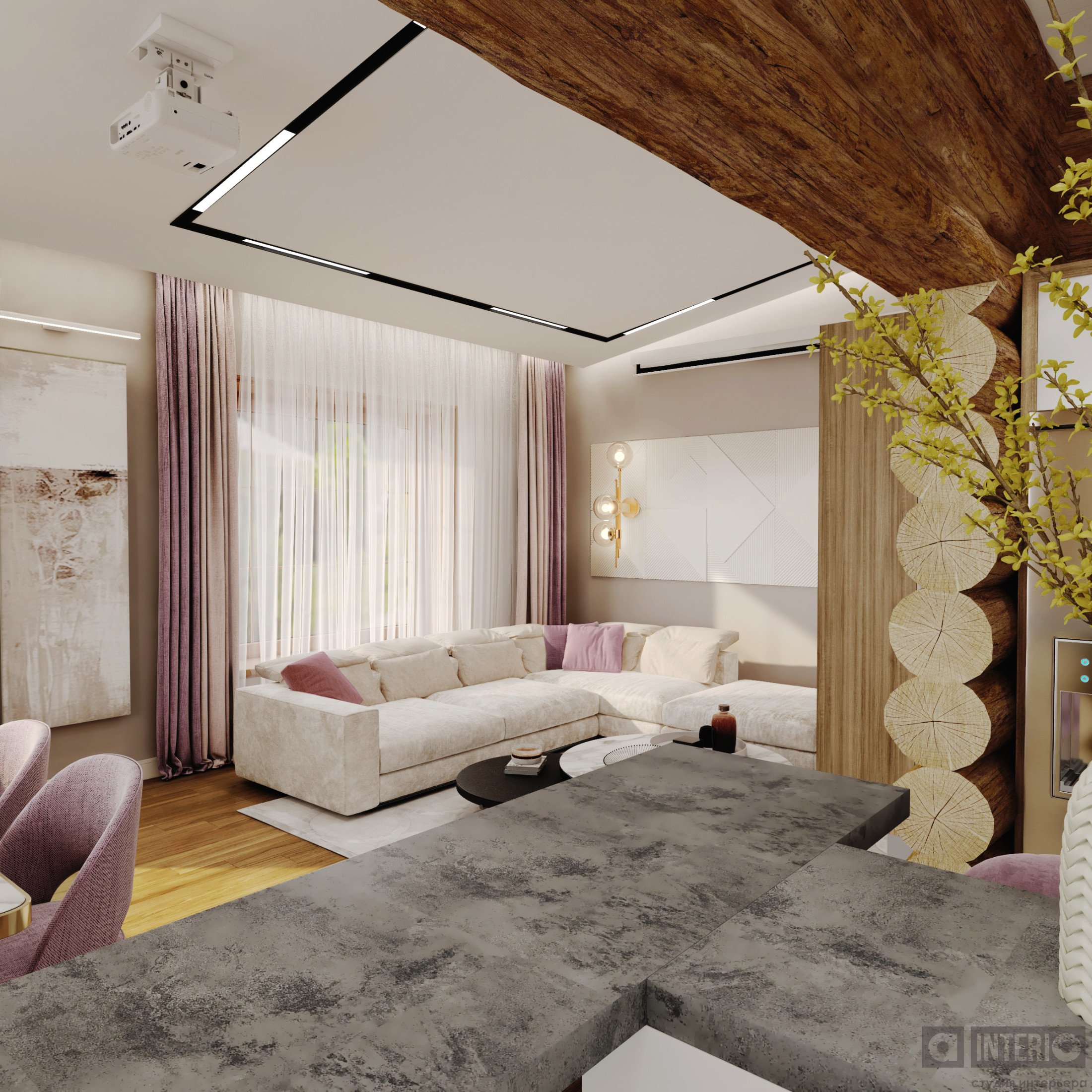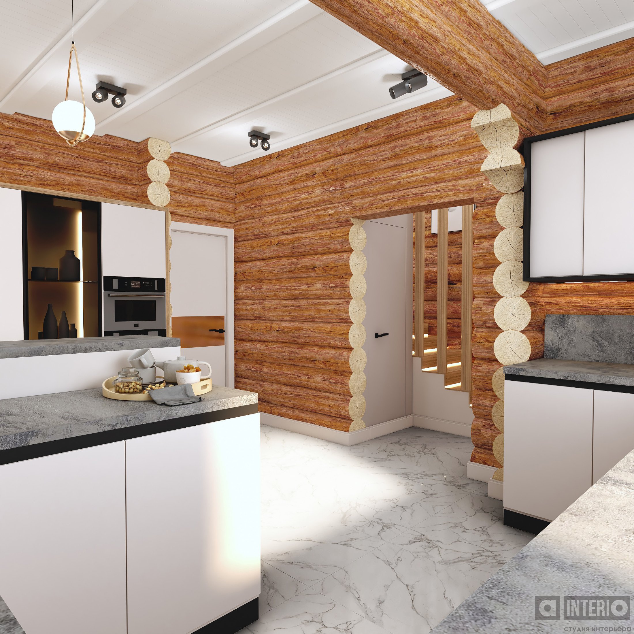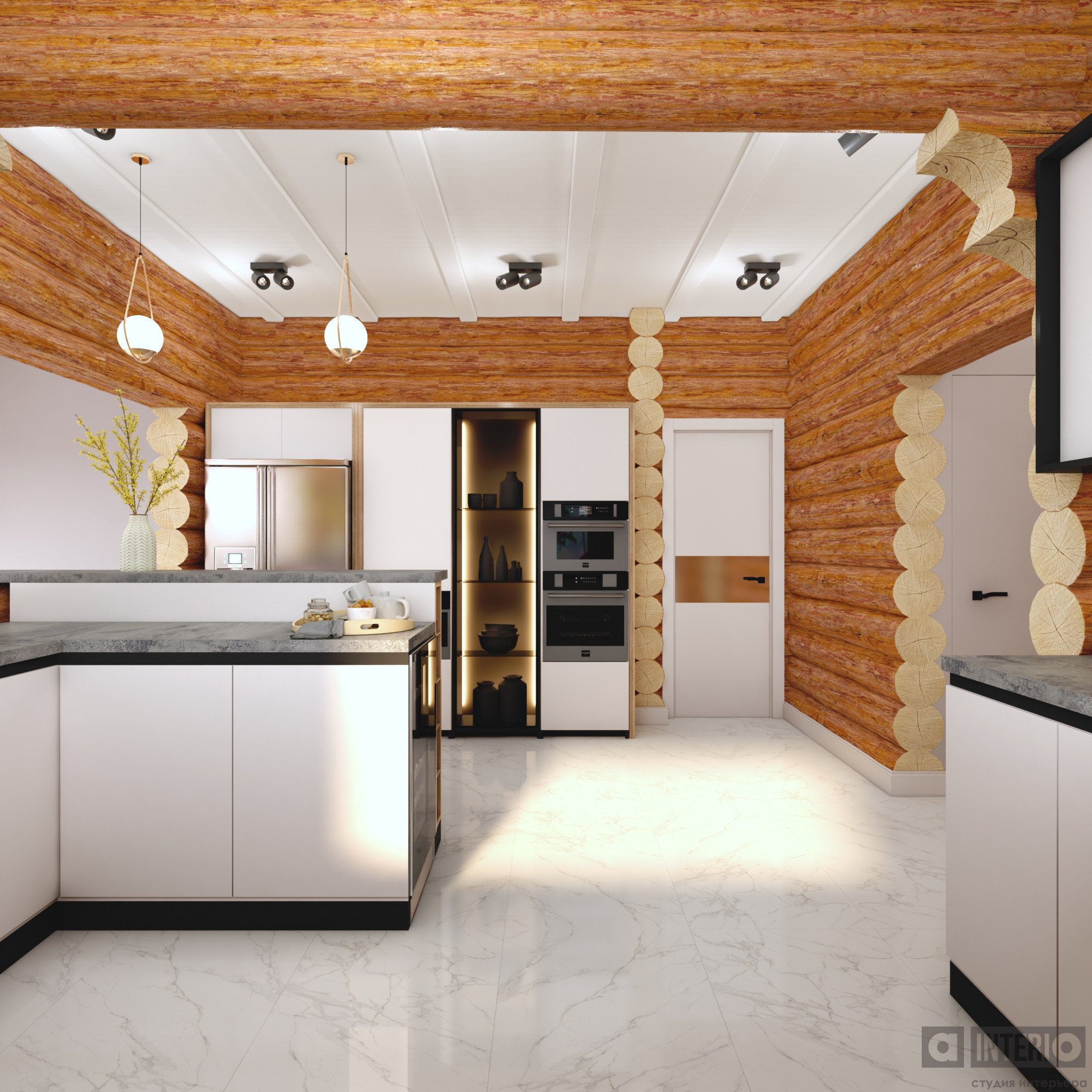 Проект интересен не только тем, что он эргономичен и изящен, но и тем, что тут соседствуют 2 материала несущих стен - кирпич и цилиндровый сруб!Постарались сделать пространство дома легким, современным и уютным!