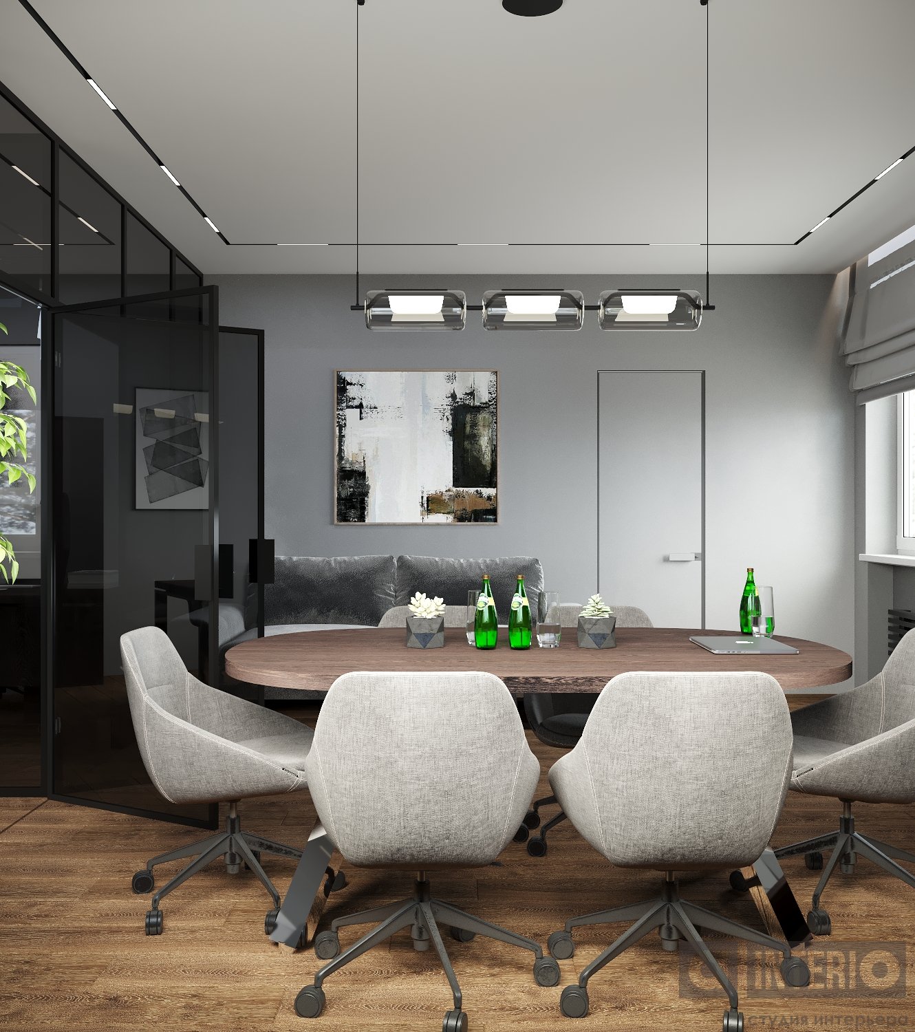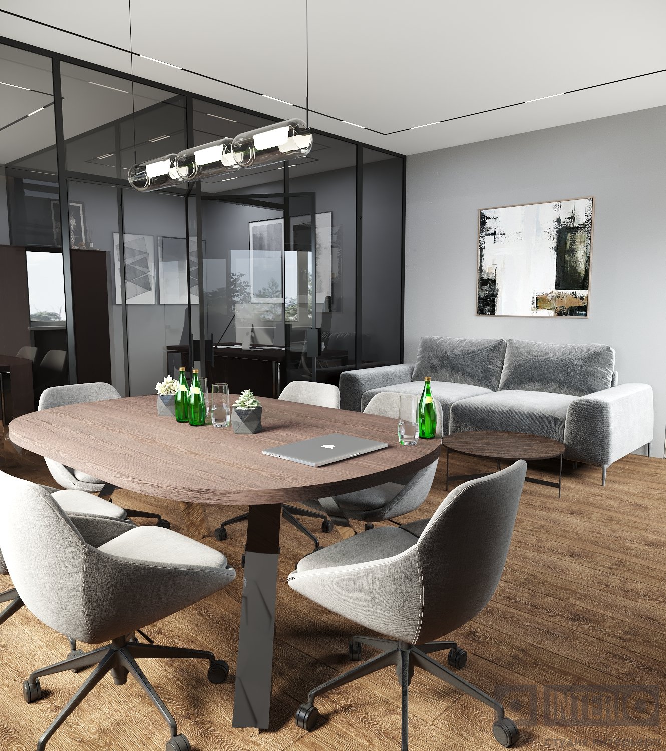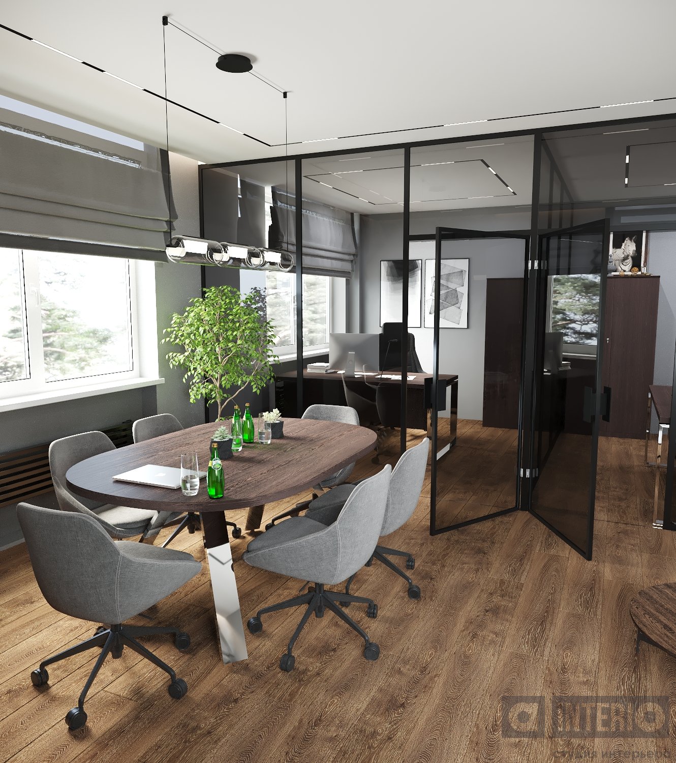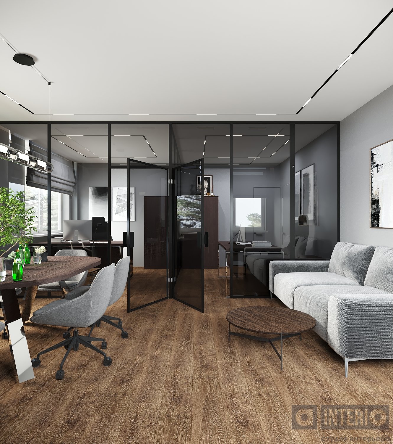 Зонирование решено с помощью стеклянной перегородки-стены. Три кабинета разных площадей и форм объединены общей стилистикой и одной линейкой современной офисной мебели для кабинетов руководителей премиум класса