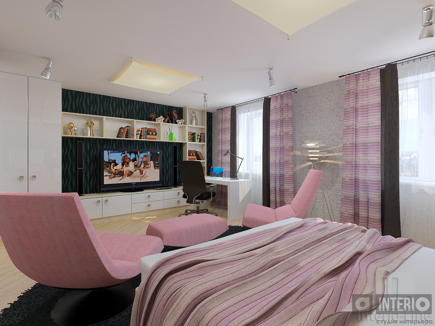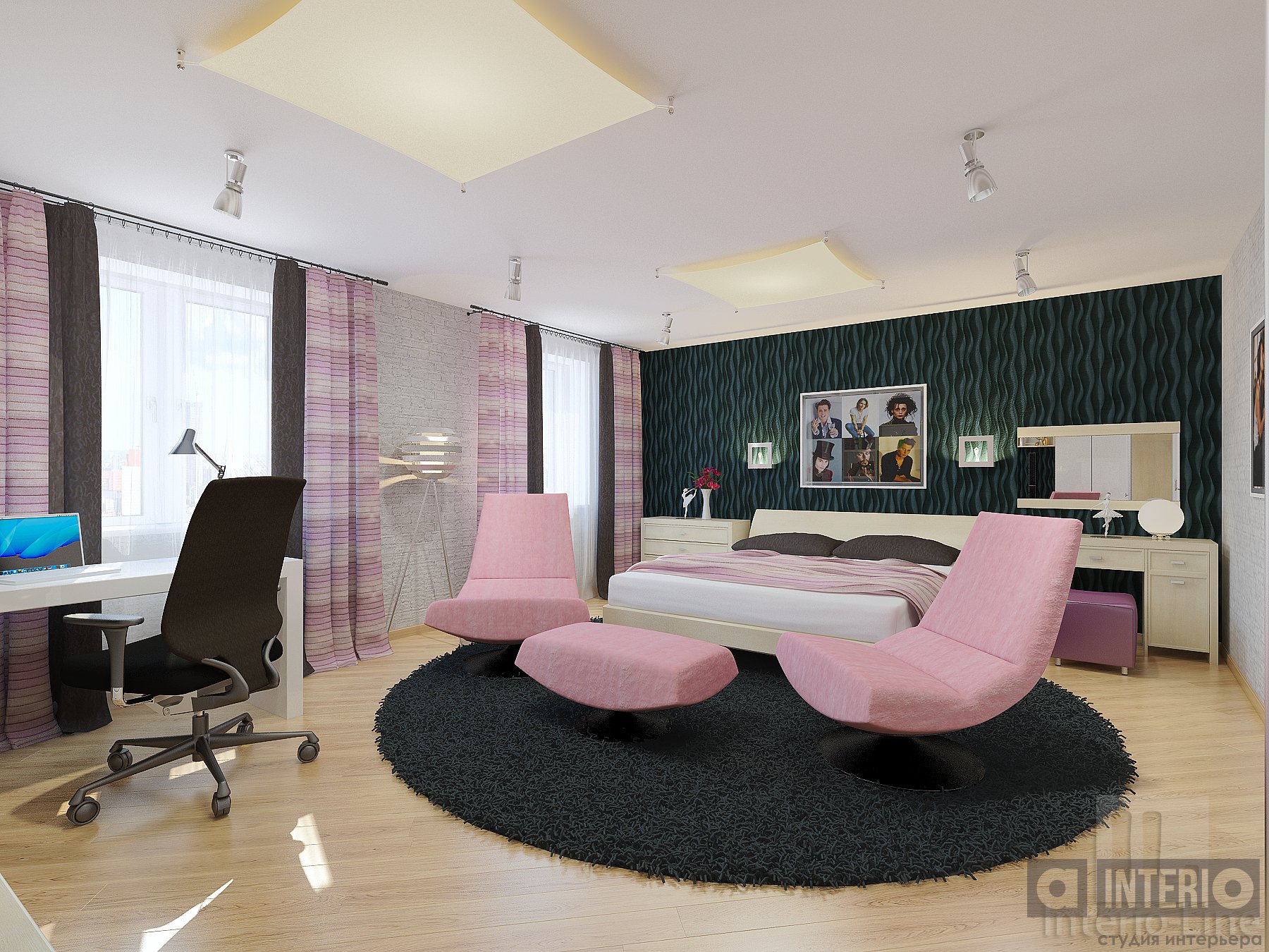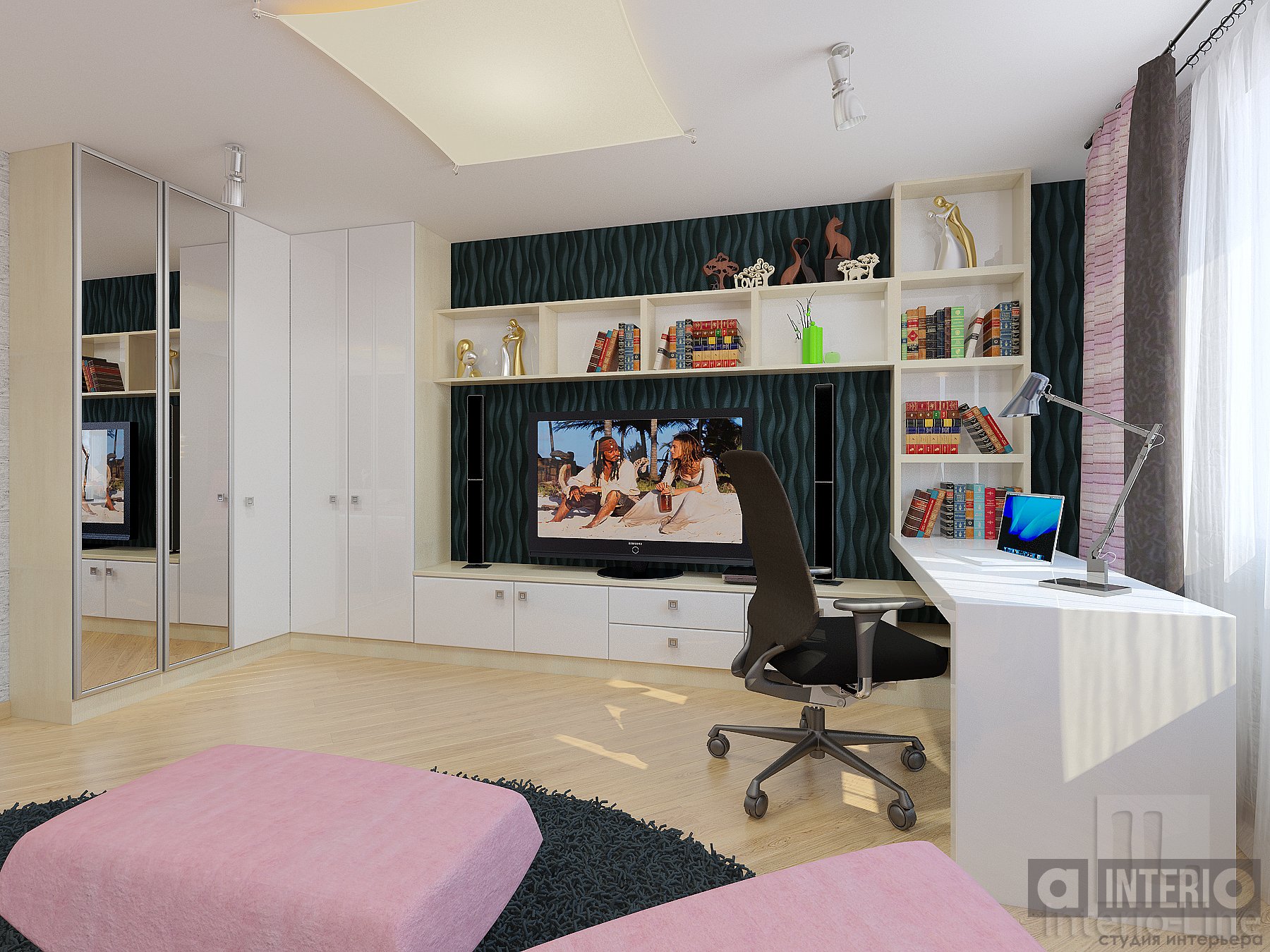 Комната дочери подростка - довольно просторная, и это важно, это всегда отдельное многофункциональное пространство - для отдыха, работы и приема друзей.