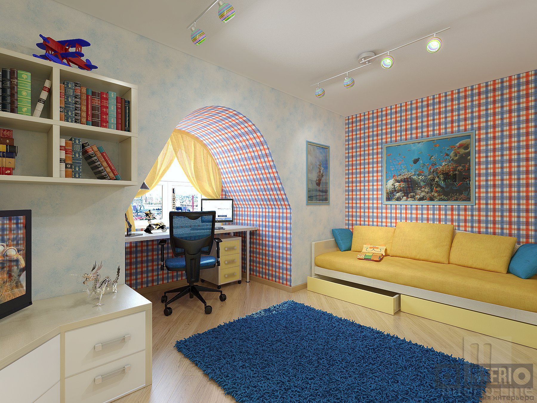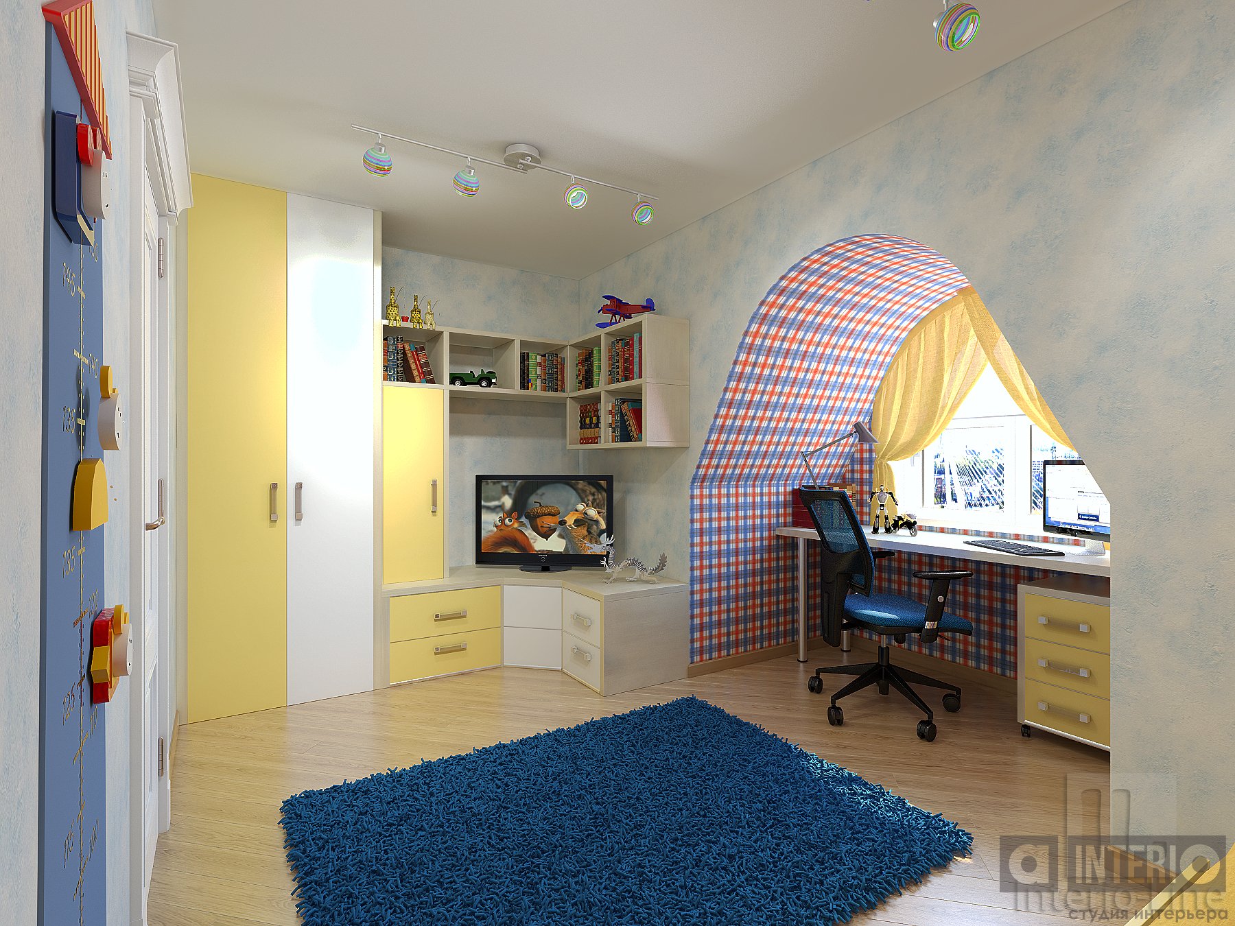 Комната сына имеет интересную архитектуру с окном в алькове. Для ребенка - уютно и необычно. Место для вдохновений и фантазий.