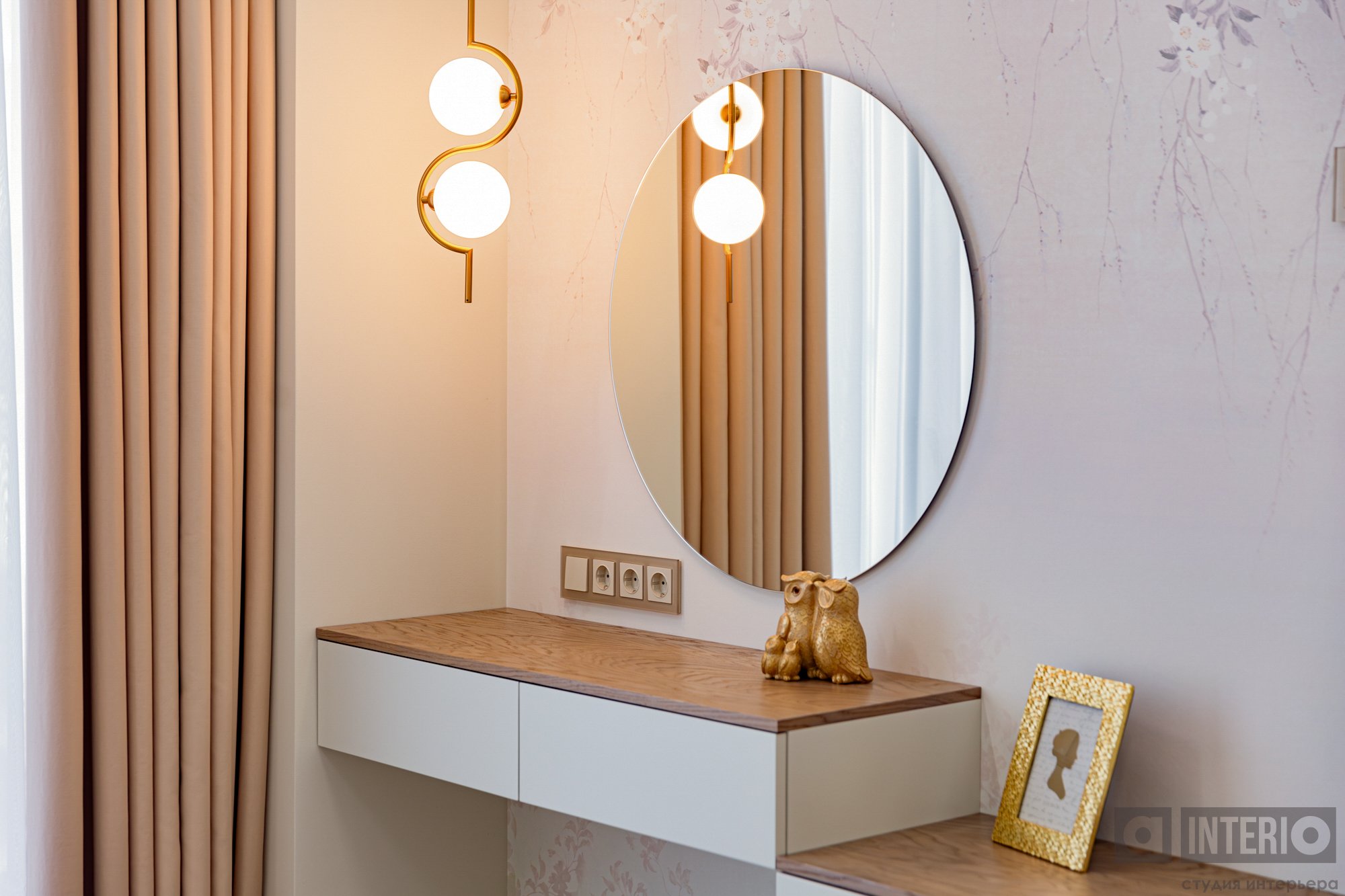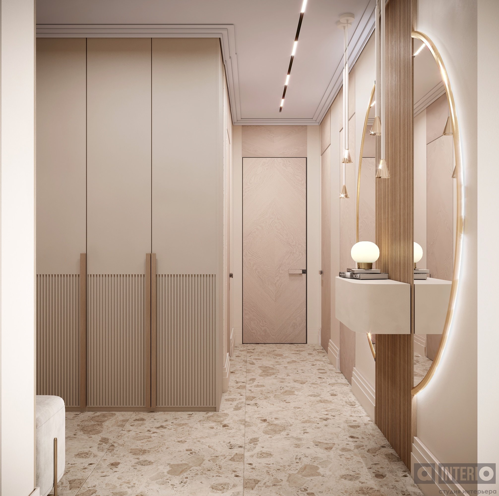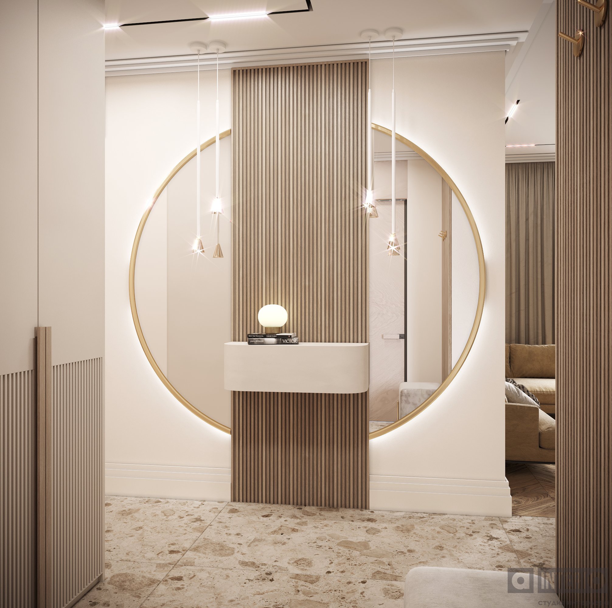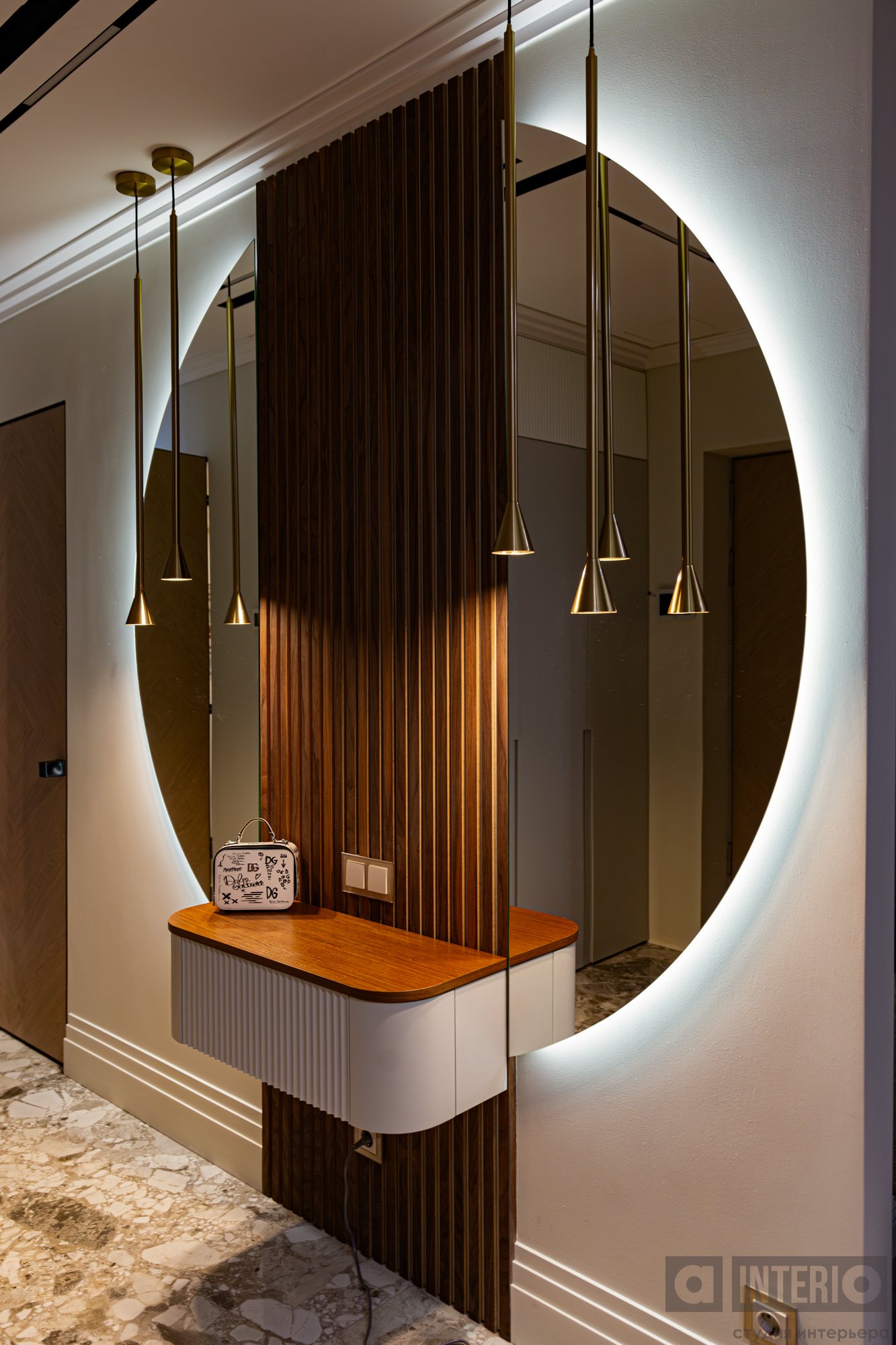 В прихожей гостей встречает выразительная композиция из радиусного зеркала с панелями и подсветкой.