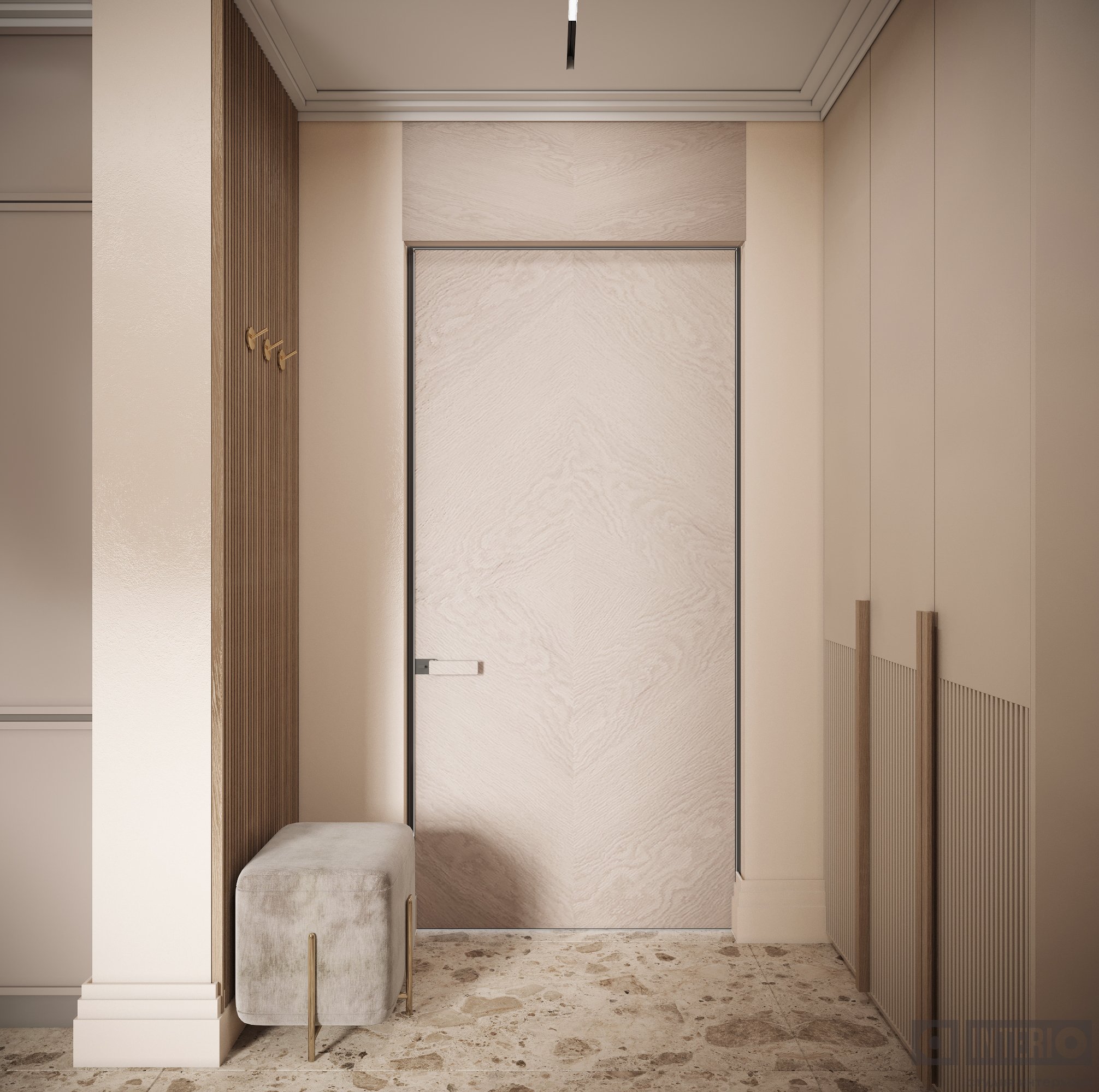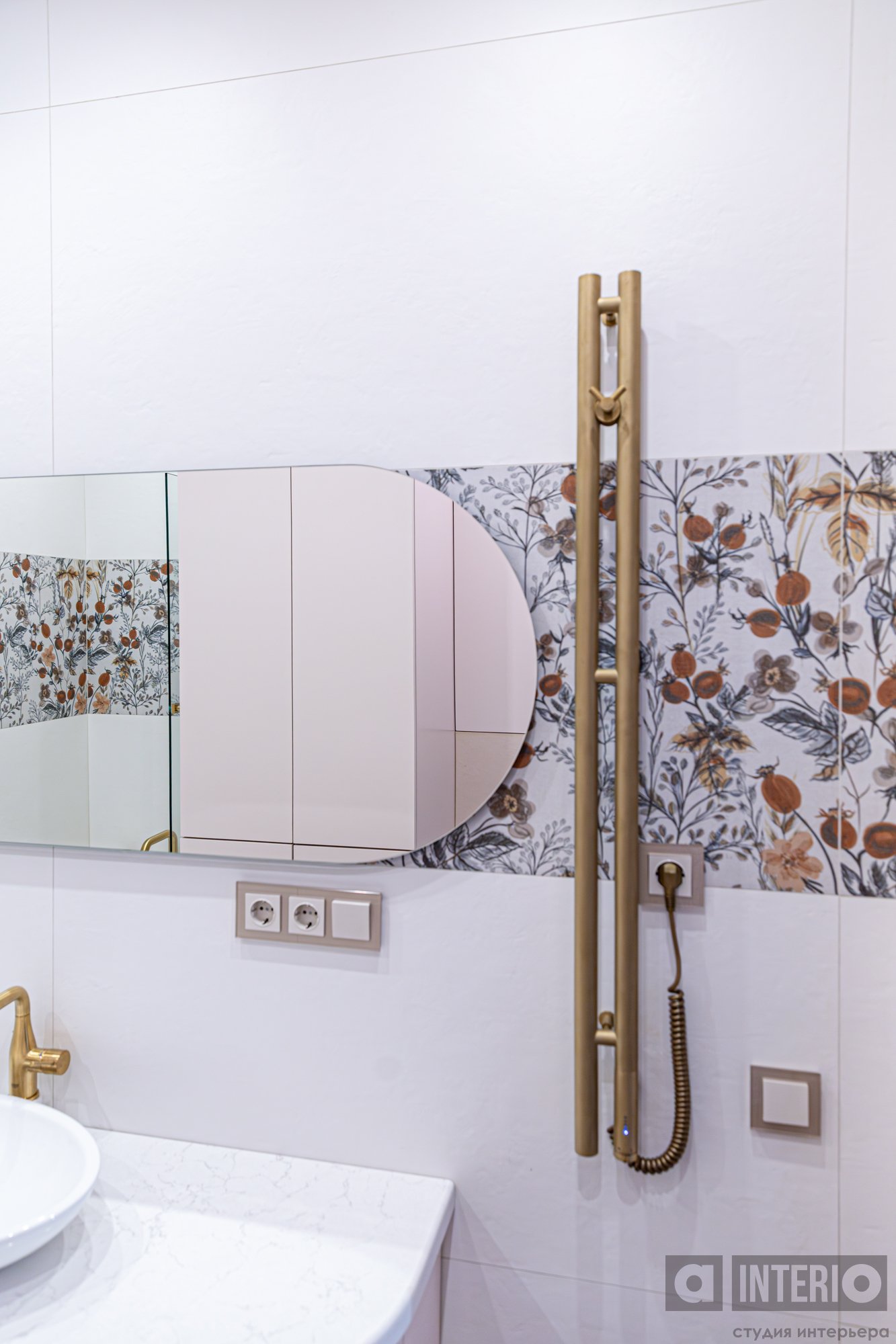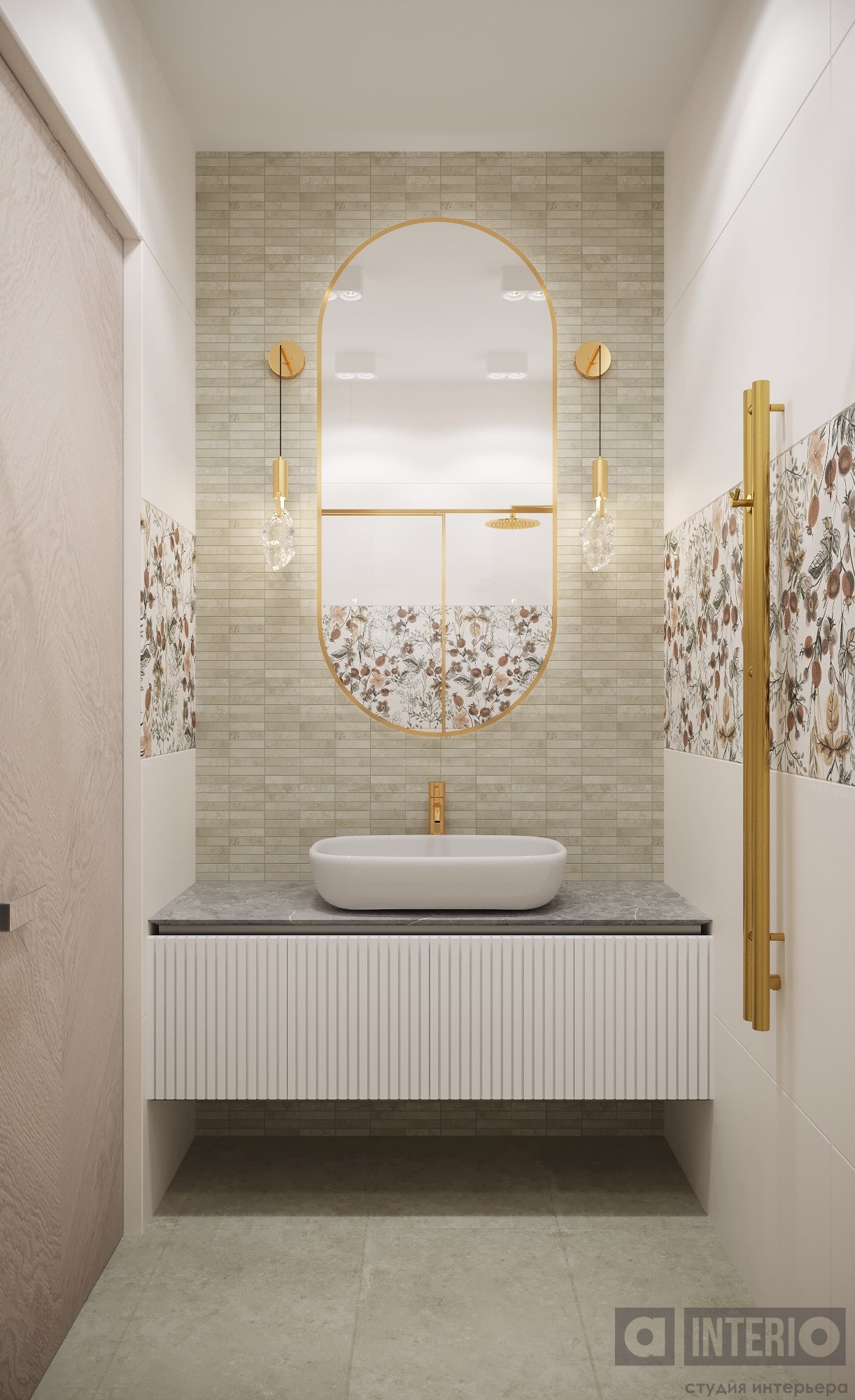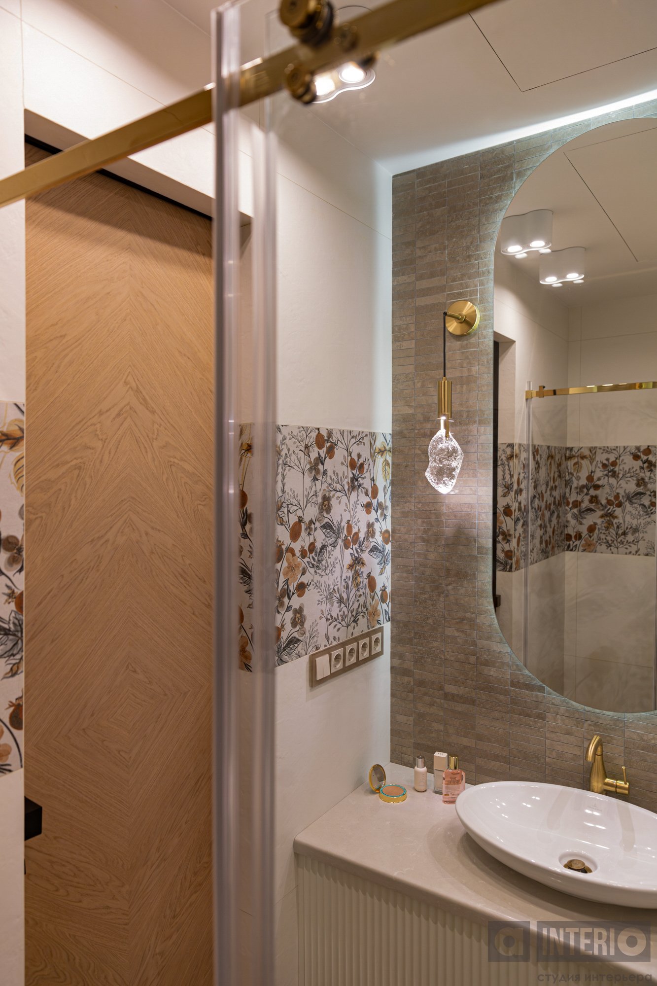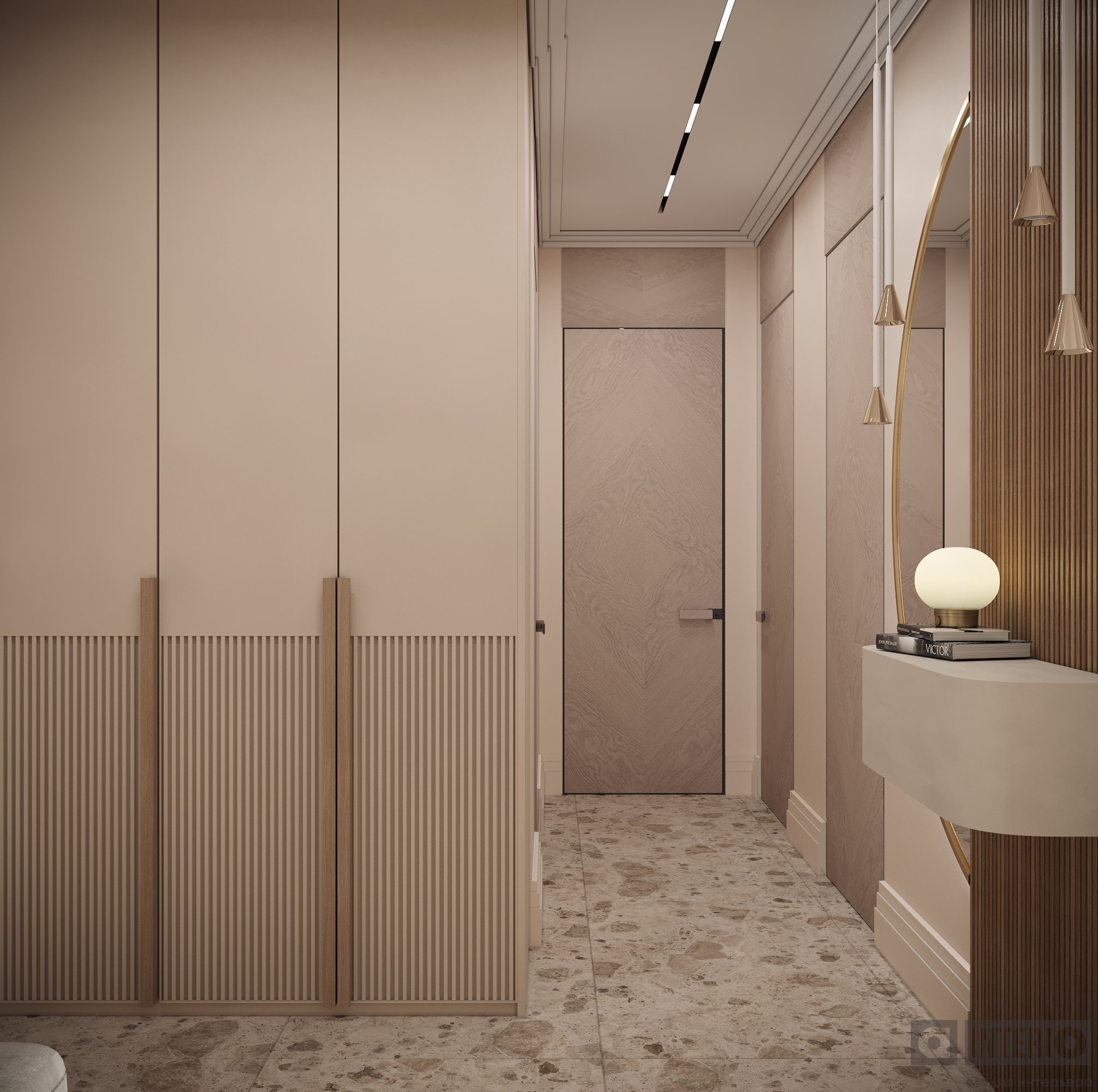 В прихожей гостей встречает выразительная композиция из радиусного зеркала с панелями и подсветкой.