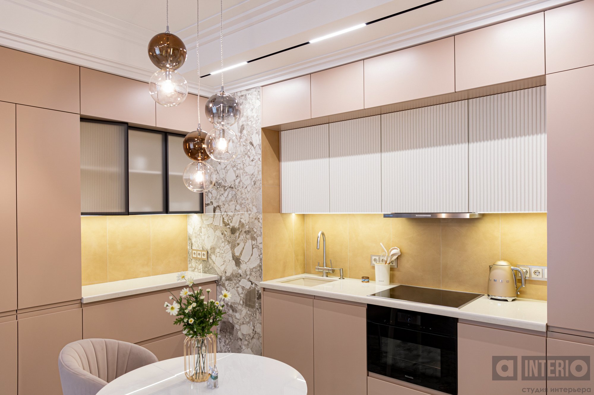 Кухню постарались максимально встроить в пространство, при этом выделив ее теплым ярким фартуком. Цвет охры повторяется и в диване.