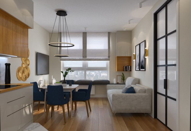 Квартира предназначена для юной леди и включает в себя совмещенную зону кухни-гостиной, полноценную душевую и ванную комнаты, 2 спальни.
